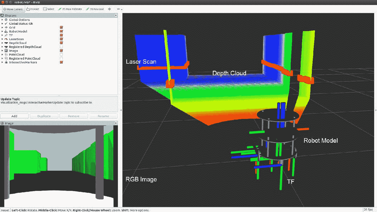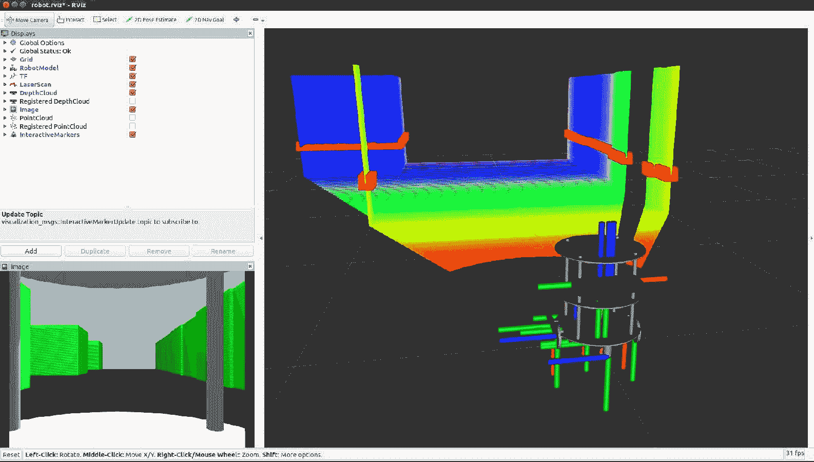 我们可以启用 Rviz 显示类型来查看不同类型的传感器数据。 在上图中,您可以看到深度云,激光扫描,TF,机器人模型和 RGB 摄像机图像。