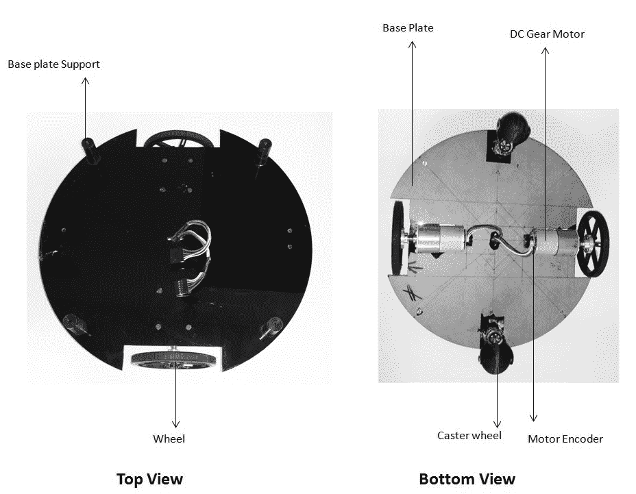 需要配置的机器人的第一部分是基板。 基板包括两个电机及其连接的车轮,脚轮和基板支架。 下图显示了底板的俯视图和仰视图: