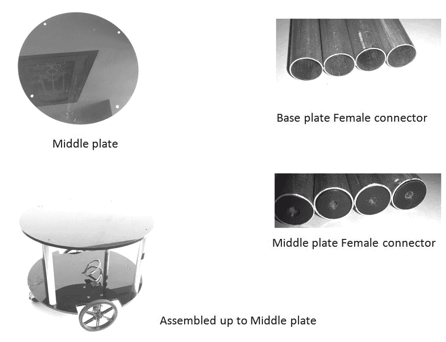 基板的半径为 15 厘米,通过从基板上切下两个部分,将电动机及其连接的车轮安装在板的相对侧。 两个橡胶脚轮安装在基板的相对两侧,以实现良好的平衡和对机器人的支撑。 我们可以为此机器人选择球形脚轮或橡胶脚轮。 两个电动机的导线通过基板中心的孔被引到基板的顶部。 为了扩展机器人的各层,我们将放置基板支架以连接以下各层。 现在,让我们看一下带有中间板和连接管的下一层。 有空心管连接底板和中间板。 空心管可以连接到基板支架。