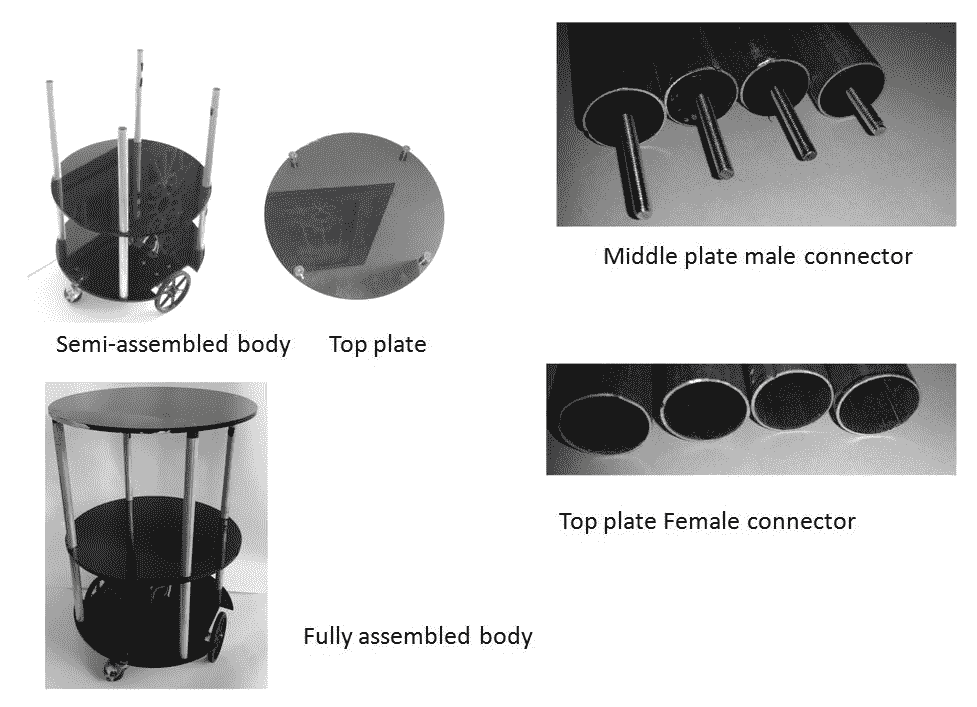 中间板公连接器有助于连接中间板和底板管的顶部。 我们可以使用顶板背面的四个支架将顶板安装在中间板管的顶部。 我们可以将顶板的母连接器插入顶板支架。 现在我们有了机器人的完整组装体。