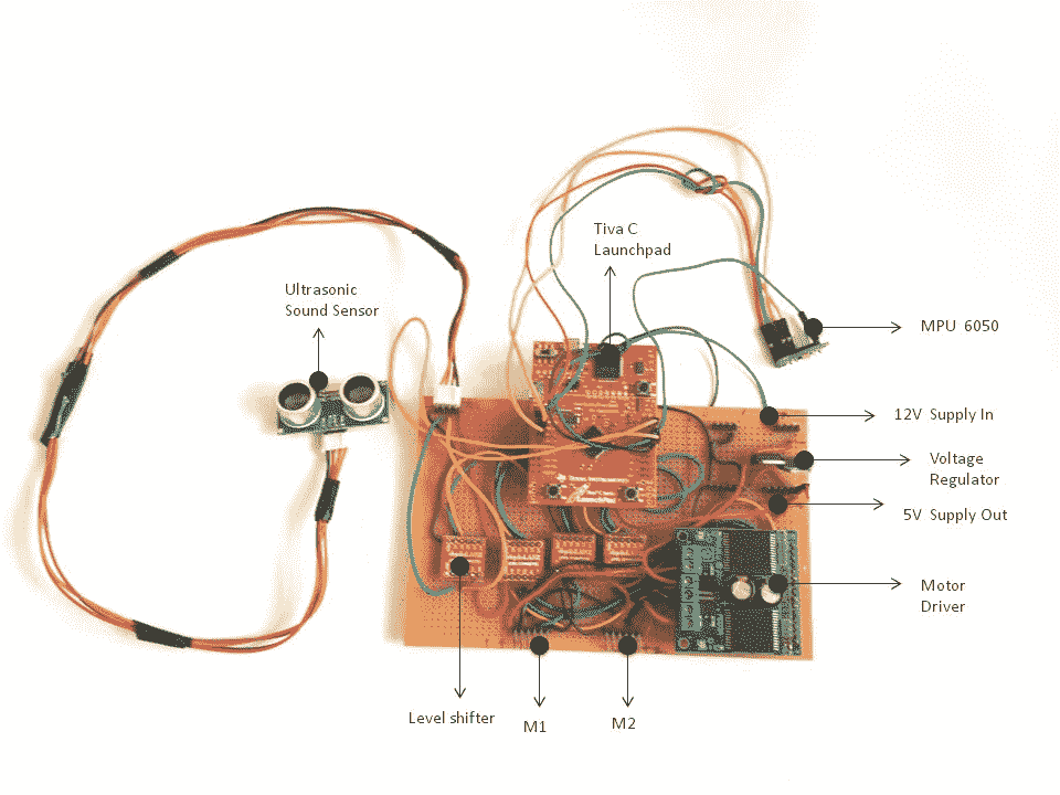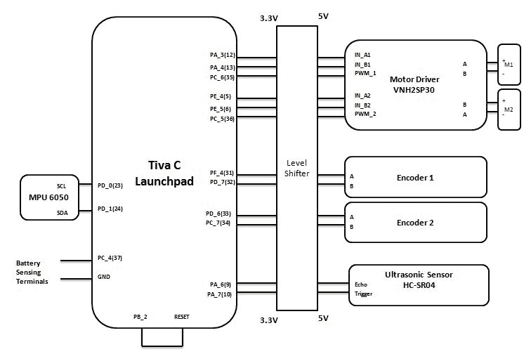 M1 和 M2 是我们在此机器人中使用的两个差动驱动电机。 我们将在这里使用的电动机是带有 Pololu 编码器的直流齿轮电动机。 电机端子连接到 Pololu 的双 VNH2SP30 电机驱动器。 其中一台电机极性相反,因为在差速转向中,一台电机的旋转方向与另一台相反。 如果我们向两个电机发送相同的控制信号,则每个电机将以相反的方向旋转。 为避免这种情况,我们将交换一台电机的电缆。 电机驱动器通过 3.3V-5V 双向电平转换器连接到 Tiva-C LaunchPad。 我们将在此处使用的电平转换器之一可在这个页面上找到。