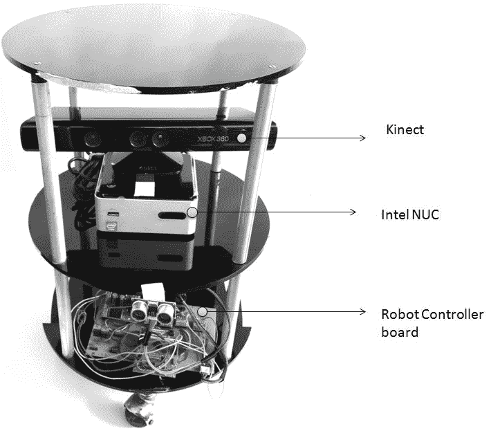 该板由放置在基板上的 12V 电池供电。 这两个电机可以直接连接到 M1 和 M2 公连接器。 NUC PC 和 Kinect 放在中间板上。 LaunchPad 板和 Kinect 应该通过 USB 连接到 NUC PC。 PC 和 Kinect 本身使用相同的 12V 电池供电。 我们可以使用铅酸或锂聚合物电池。 在这里,我们将铅酸电池用于测试目的。 稍后,我们将迁移到锂聚合物电池以获得更好的性能和更好的备用。 下图显示了完整的 ChefBot 组装图: