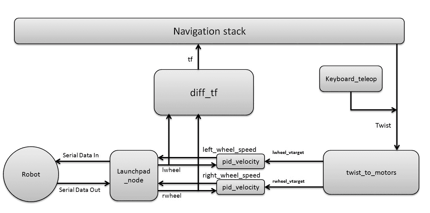 从 Tiva C Launchpad 接收到串行端口数据后,ROS Python 节点将接收串行值并将其转换为 ROS 主题。 PC 中还存在其他 ROS 节点,这些节点订阅了这些传感器主题并计算了机器人的里程表。 来自车轮编码器的数据和 IMU 值相结合,以计算机器人的里程表。 机器人通过订阅超声传感器主题和激光扫描来检测障碍物,并使用 PID 节点控制车轮电机的速度。 该节点将线速度命令转换为差速轮速度命令。 运行这些节点之后,我们可以运行 SLAM 来绘制区域地图,运行 SLAM 之后,我们可以运行 AMCL 节点以进行本地化和自主导航。