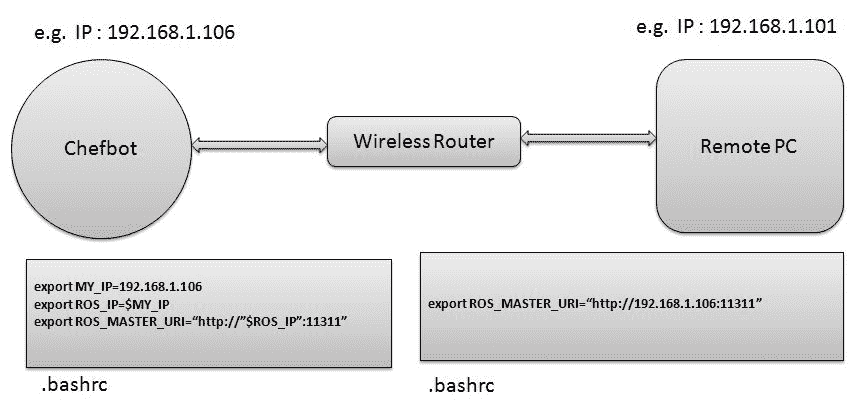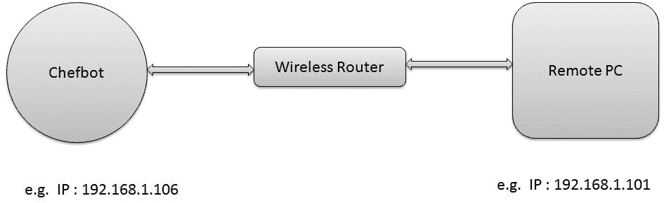 与 ChefBot 一起使用之前,我们应该拥有的主要设备是好的无线路由器。 机器人和远程笔记本电脑必须通过同一网络连接。 如果机械手 PC 和远程膝上型计算机位于同一网络上,则用户可以使用 IP 地址通过 SSH 通过 SSH 从远程便携式计算机连接到机械手 PC。 在将机器人 PC 放入机器人之前,我们应该将机器人 PC 连接到无线网络,这样一旦将其连接到无线网络,它就会记住连接细节。 机器人通电后,PC 应自动连接到无线网络。 一旦机器人 PC 连接到无线网络,我们就可以将其放入实际的机器人中。 下图显示了机器人和远程 PC 的连接图: