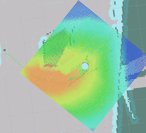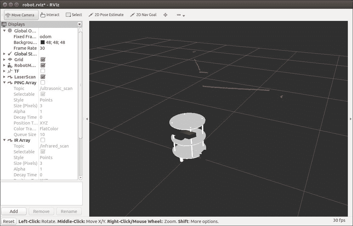 以下屏幕截图是 RViz 的输出。 我们可以在屏幕截图中看到 LaserScan 和 PointCloud 映射的数据: