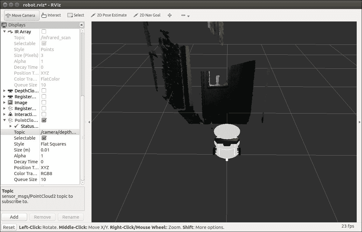 上面的屏幕截图显示了 RViz 中的 LaserScan。 我们需要在 RViz 的左侧部分打上 LaserScan 主题,以显示激光扫描数据。 激光扫描数据标记在视口上。 如果要查看 Kinect/Astra 中的点云数据,请单击 RViz 左侧的“添加”按钮,然后从弹出窗口中选择 PointCloud2。 选择主题,从列表中单击/camera/depth_registered,您将看到类似于以下屏幕快照中所示的图像: