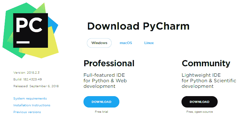 此外,建议您安装集成开发环境(IDE)包,因为它有助于计算机程序员进行软件开发。 从这个意义上讲,建议使用 Python 特定的 IDE。 实际上是 Python IDE 是 PyCharm,可以从这里下载。