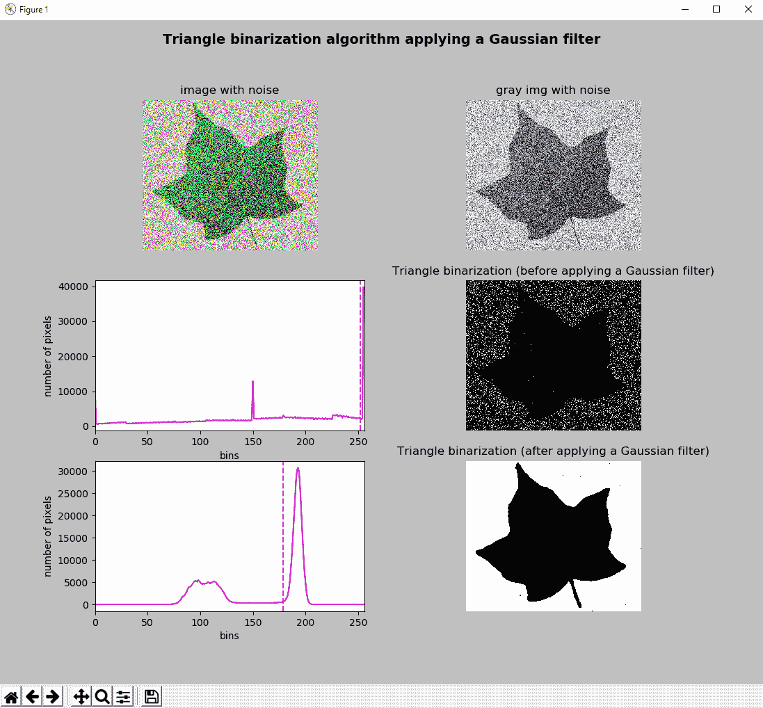 您会看到,应用高斯过滤器是过滤噪声的好方法。 这样,三角二值化算法可以正确地分割叶子。