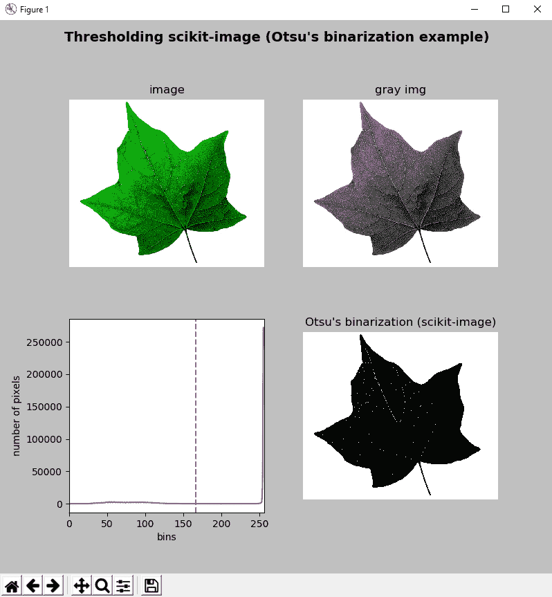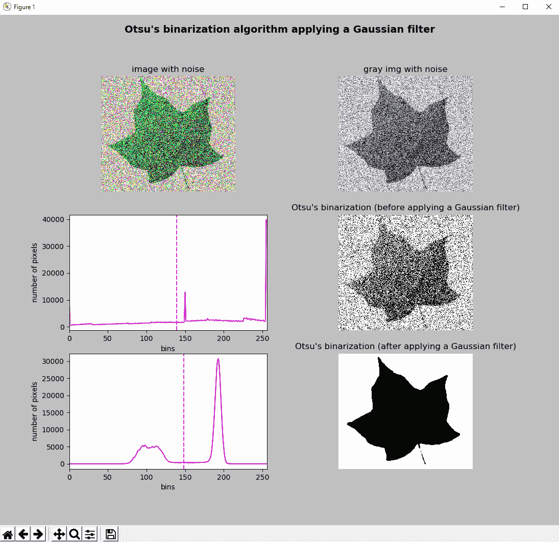 如我们所见,如果不应用平滑过滤器(在这种情况下为高斯过滤器),则阈值图像也会充满噪声。 但是,应用高斯过滤器是正确过滤噪声的好方法。 此外,滤波后的图像是双峰的。 这个事实可以在对应于滤波图像的直方图中看到。 在这种情况下,大津的二值化算法可以正确分割叶子。