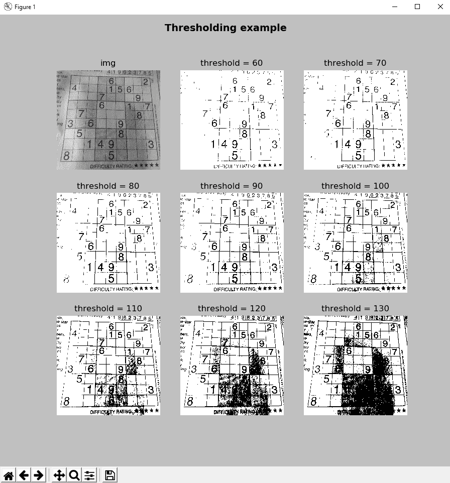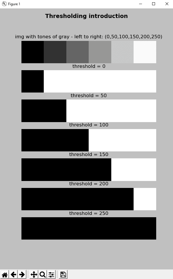 您将看到阈值与样本图像中不同的灰度色调相同。 用不同的阈值对样本图像进行阈值处理的代码如下: