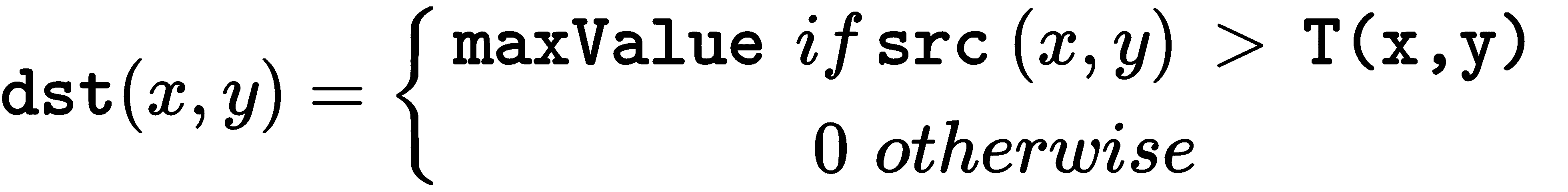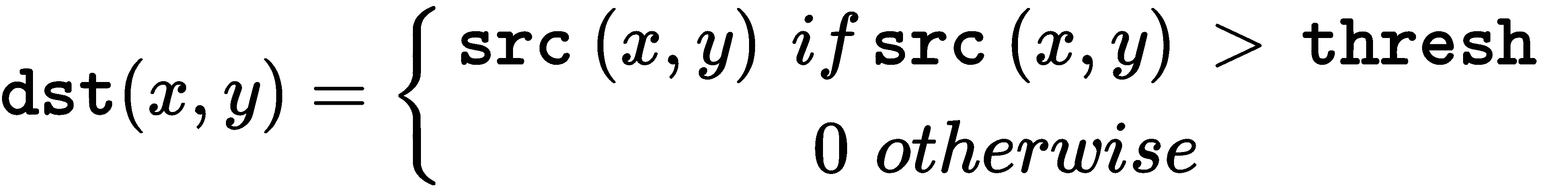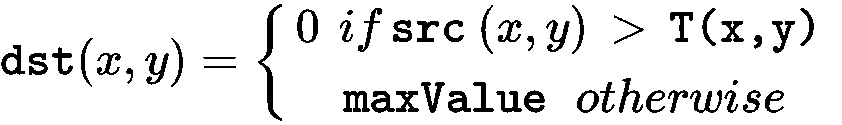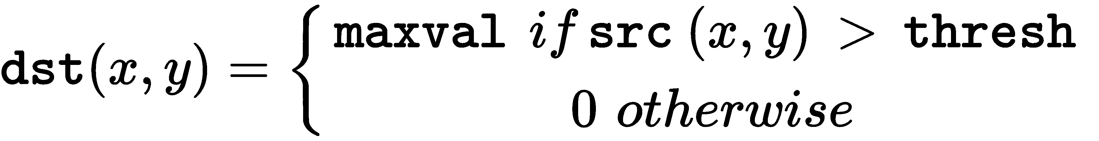 阈值操作的类型根据其公式描述。 考虑到src是源(原始)图像,而dst对应于阈值化后的目标(结果)图像。 从这个意义上讲,src(x, y)对应于源图像像素(x, y)的强度,而dst(x, y)将对应于目标图像的像素(x, y)的强度。