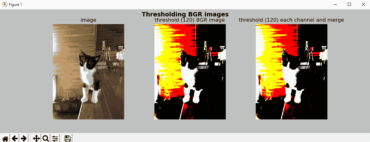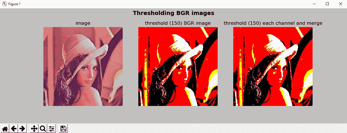 cv2.threshold()函数也可以应用于多通道图像。 可以在thresholding_bgr.py脚本中看到。 在这种情况下,cv2.threshold()函数在 BGR 图像的每个通道中应用阈值操作。 这产生与在每个通道中应用此函数并合并阈值通道相同的结果: