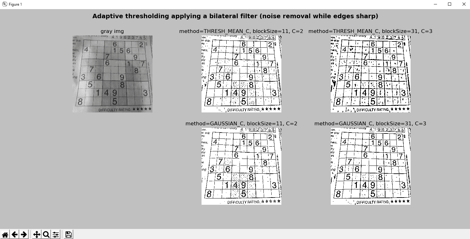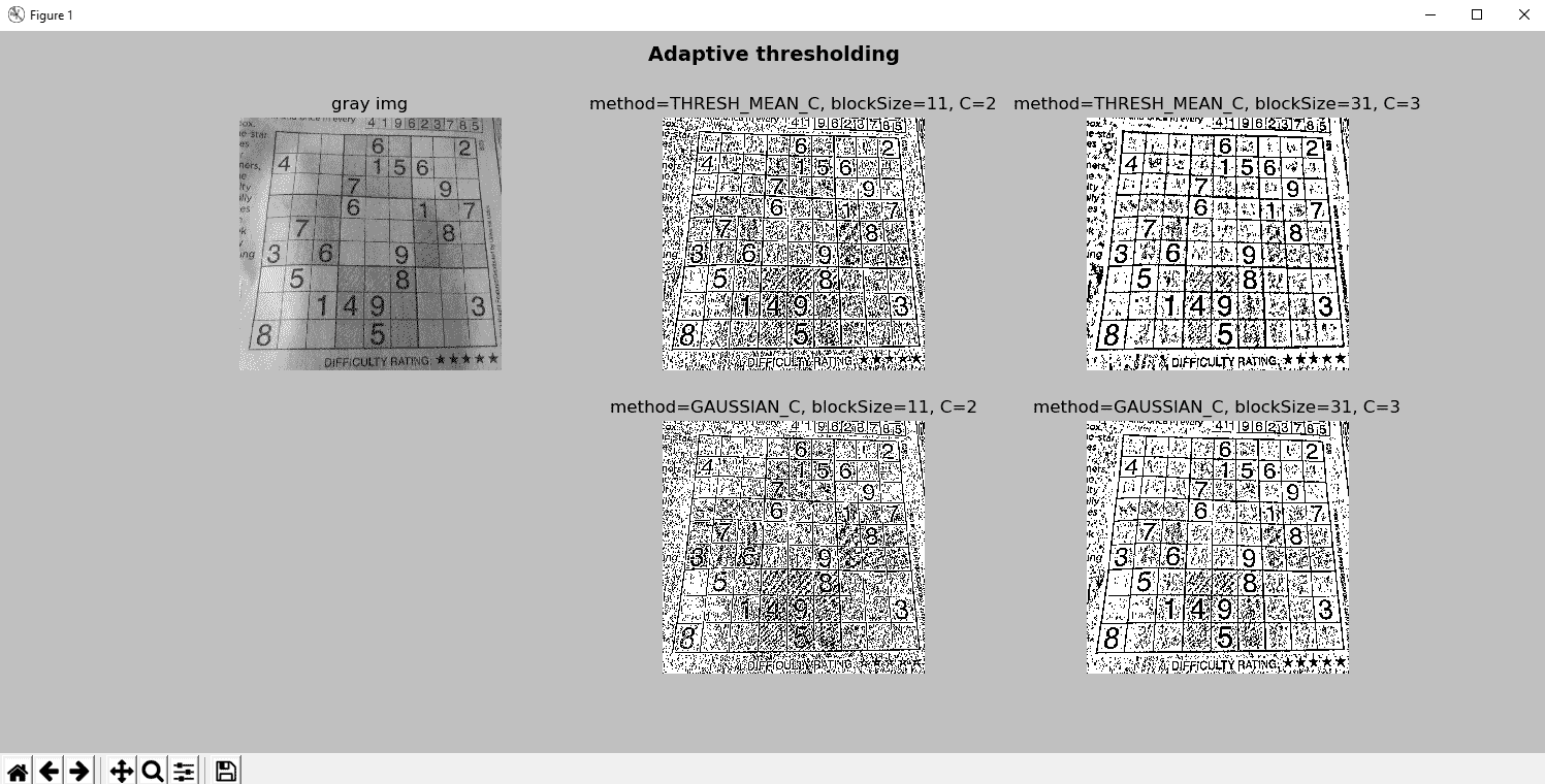 cv2.adapativeThreshold(),cv2.ADAPTIVE_THRESH_MEAN_C,C=2和blockSize=9应用自适应阈值运算。 - 使用