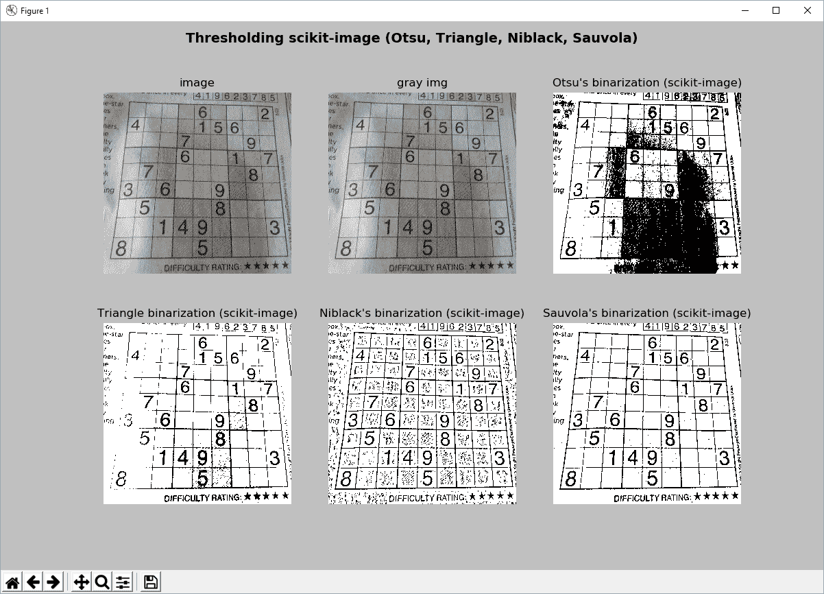 为了对 scikit-image 执行阈值化操作,我们调用每种阈值化方法(threshold_otsu(),threshold_niblack(),threshold_sauvola()和threshold_triangle()):