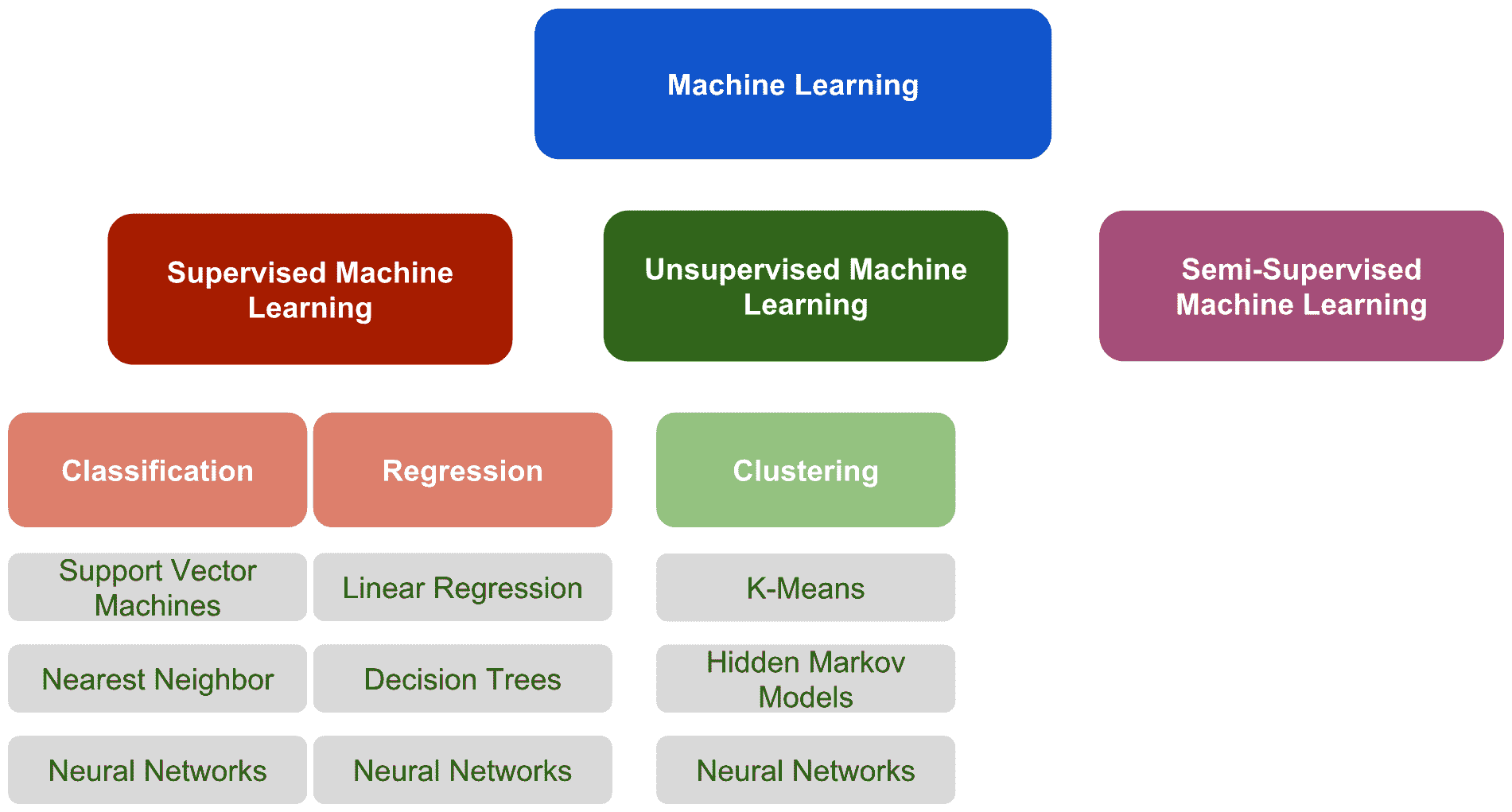 在机器学习的上下文中,有三种主要方法-监督机器学习,无监督机器学习和半监督的机器学习技术。 这些方法可以在下图中看到。 为了完成它,我们包含了三种最常见的技术来解决分类,回归和聚类问题: