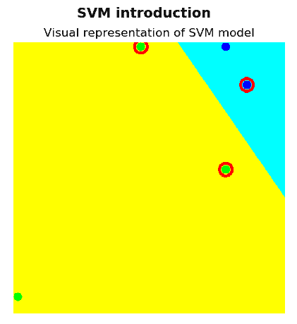如您所见,已使用训练数据和由五个点组成的标签(对两个点分配了类别1,而对其他三个点分配了类别-1)对 SVM 进行了训练,之后将其用于分类图片中的所有像素。 这种分类导致将图像划分为黄色和青色区域。 此外,您可以看到两个区域之间的边界对应于两个类别之间的最佳间隔,因为到两个类别中每个类别的最近元素的距离最大。 支持向量以红线边框显示。