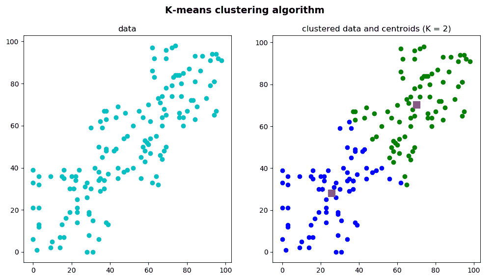 在k_means_clustering_k_2.py脚本中,数据已集群为2集群。 第一步是定义算法终止标准。 在这种情况下,最大迭代次数设置为20(max_iterm = 20),ε设置为1.0(epsilon = 1.0):