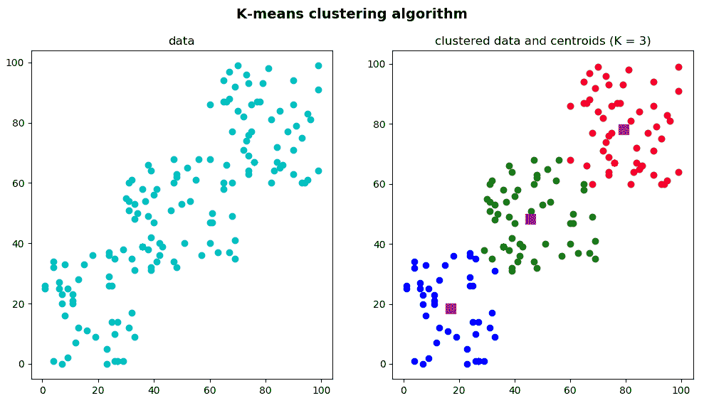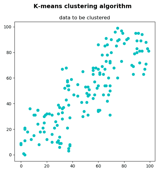 在这种情况下,每个点都有对应于(x, y)坐标的两个特征。 这些坐标可以表示例如每个150人的身高和体重,或每个150房屋的卧室数量和大小。 在第一种情况下,K 均值聚类算法将决定 T 恤的尺寸(例如,如果K=3为小,中或大),而在第二种情况下,K 均值聚类算法将决定房子的价格(例如K = 4,便宜,中等,昂贵或非常昂贵)。 总之,data将是我们的聚类算法的输入。