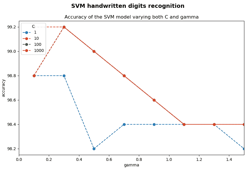 另外,使用RBF核时,有两个重要参数-C和γ。 在这种情况下,为C=12.5和γ=0.50625。 和以前一样,对于给定的问题(取决于数据集),C和γ并不为人所知。 因此,必须进行某种参数搜索。 因此,目标是确定推荐使用C和γ的网格搜索的良好(C和γ)。