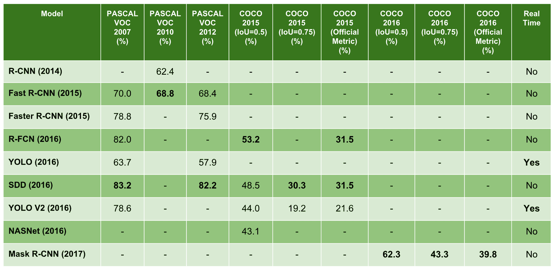 在下表中,您可以看到使用上述三个数据集评估的用于对象检测的最新深度学习算法,其中显示了 PASCAL VOC 和 COCO 数据集上的 mAP 得分: