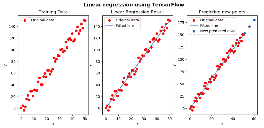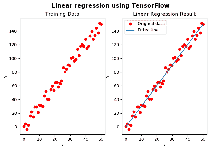 如前面的屏幕快照所示,我们既可以看到训练数据(在左侧),也可以看到与线性回归模型相对应的拟合线(在右侧)。