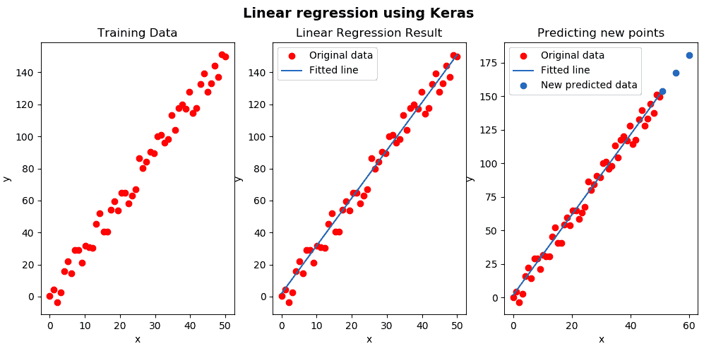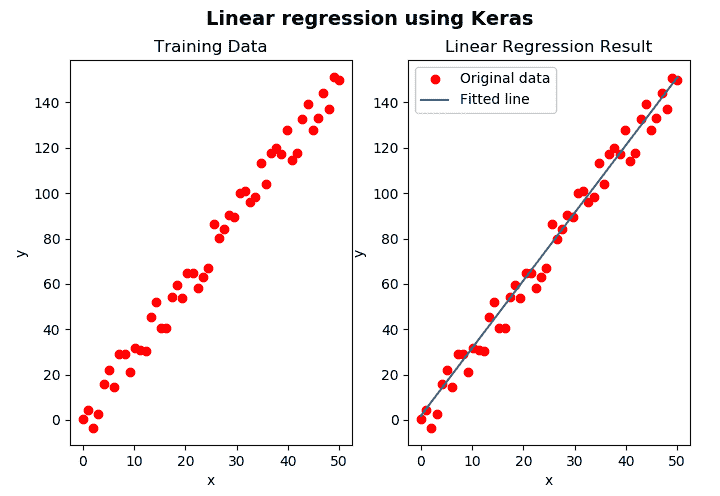 Keras 是用 Python 编写的开放源代码,高级神经网络 API(与 Python 2.7-3.6 兼容)。 它能够在 TensorFlow,Microsoft Cognitive Toolkit,Theano 或 PlaidML 之上运行,并且其开发重点是实现快速实验。 在本节中,我们将看到两个示例。 在第一个示例中,我们将看到如何使用与上一节中的 TensorFlow 示例相同的输入数据来解决线性回归问题。 在第二个示例中,我们将使用 MNIST 数据集对一些手写数字进行分类,就像在上一节中使用 TensorFlow 进行的操作一样。 这样,当解决相同类型的问题时,您可以清楚地看到两个库之间的差异。