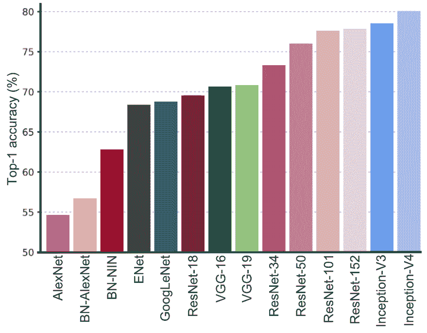 继 AlexNet 在此竞赛中获得成功之后,许多其他深度学习架构也已提交 ImageNet 挑战赛,以实现更好的表现。 从这个意义上讲,下一张图展示了提交给 ImageNet 挑战的最相关的深度学习方法的一站式准确率,包括最左侧的 AlexNet(2012)架构,以及迄今为止表现最佳的 Inception-V4(2016) 对:
