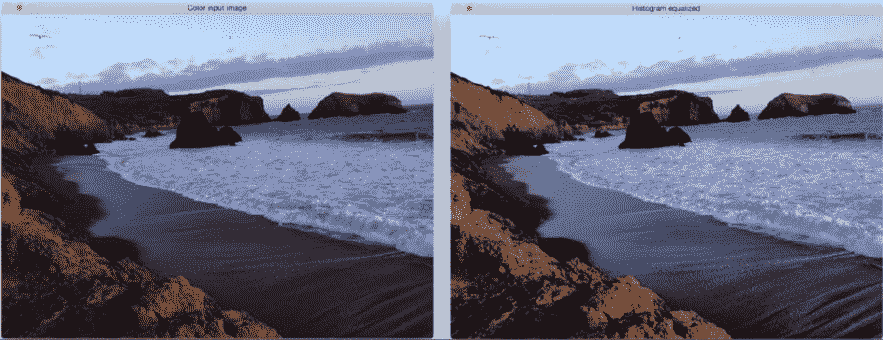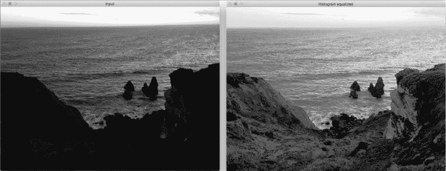 直方图均衡化适用于灰度图像。 OpenCV 提供了equalizeHist函数来实现此效果。 就像我们在这里看到的那样,代码非常简单,我们读取图像并均衡其直方图以归一化亮度并增加图像的对比度。