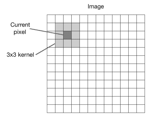 卷积是图像处理中的基本操作。 我们基本上将数学运算符应用于每个像素,并以某种方式更改其值。 为了应用该数学运算符,我们使用另一个称为核的矩阵。 核的大小通常比输入图像小得多。 对于图像中的每个像素,我们将核放在顶部,以使核的中心与所考虑的像素重合。 然后,我们将核矩阵中的每个值与图像中的相应值相乘,然后将其求和。 这是将应用于输出图像中该位置的新值。