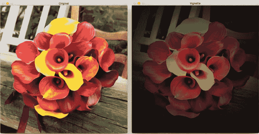 晕影过滤器基本上将亮度聚焦在图像的特定部分上,而其他部分则显得褪色。 为了实现这一点,我们需要使用高斯核过滤掉图像中的每个通道。 OpenCV 提供了执行此操作的函数,称为getGaussianKernel。 我们需要构建一个 2D 核,其大小与图像的大小匹配。 函数的第二个参数getGaussianKernel很有趣。 它是高斯的标准差,它控制明亮的中心区域的半径。 您可以试用此参数,并查看它如何影响输出。