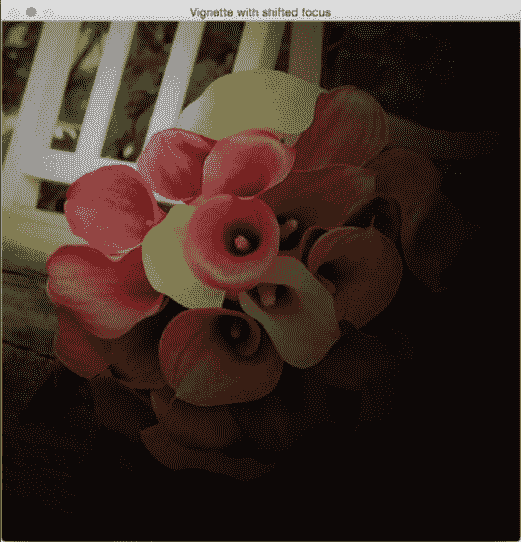 现在,我们知道如何创建聚焦于图像中心的小插图过滤器。 假设我们要实现相同的晕影效果,但我们要关注图像中的其他区域,如下图所示: