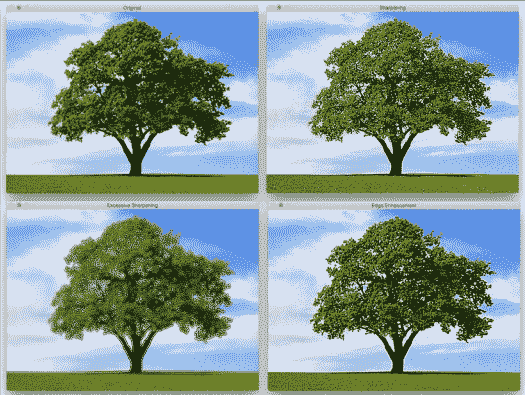 您一定已经在图像过滤代码示例中注意到了一种常见模式。 我们构建一个核,然后使用filter2D获得所需的输出。 这也正是此代码示例中发生的事情! 您可以使用核中的值,看看是否可以获得不同的视觉效果。 确保在应用核之前对核进行了标准化,否则图像将显得太亮,因为您是在人为地增加图像中的像素值。