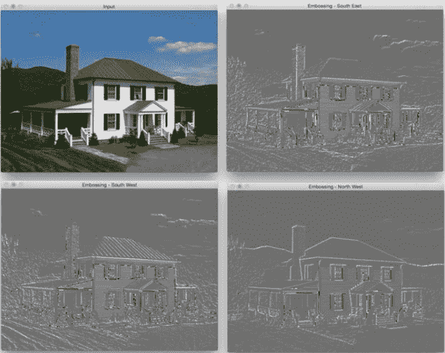 如果运行前面的代码,您将看到输出图像已浮雕。 从前面的核可以看到,我们只是将当前像素值替换为特定方向上相邻像素值的差。 通过将图像中的所有像素值都偏移128来实现浮雕效果。 此操作将高光/阴影效果添加到图片。