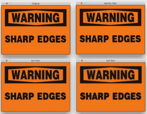 在前面的代码中,我们在代码中生成了kernel_identity,kernel_3x3和kernel_5x5不同的核。 我们使用filter2D函数将这些核应用于输入图像。 如果仔细查看图像,您会发现随着我们增加核大小,它们会变得越来越模糊。 其原因是因为当我们增加核大小时,我们在更大的区域进行平均。 这往往具有较大的模糊效果。