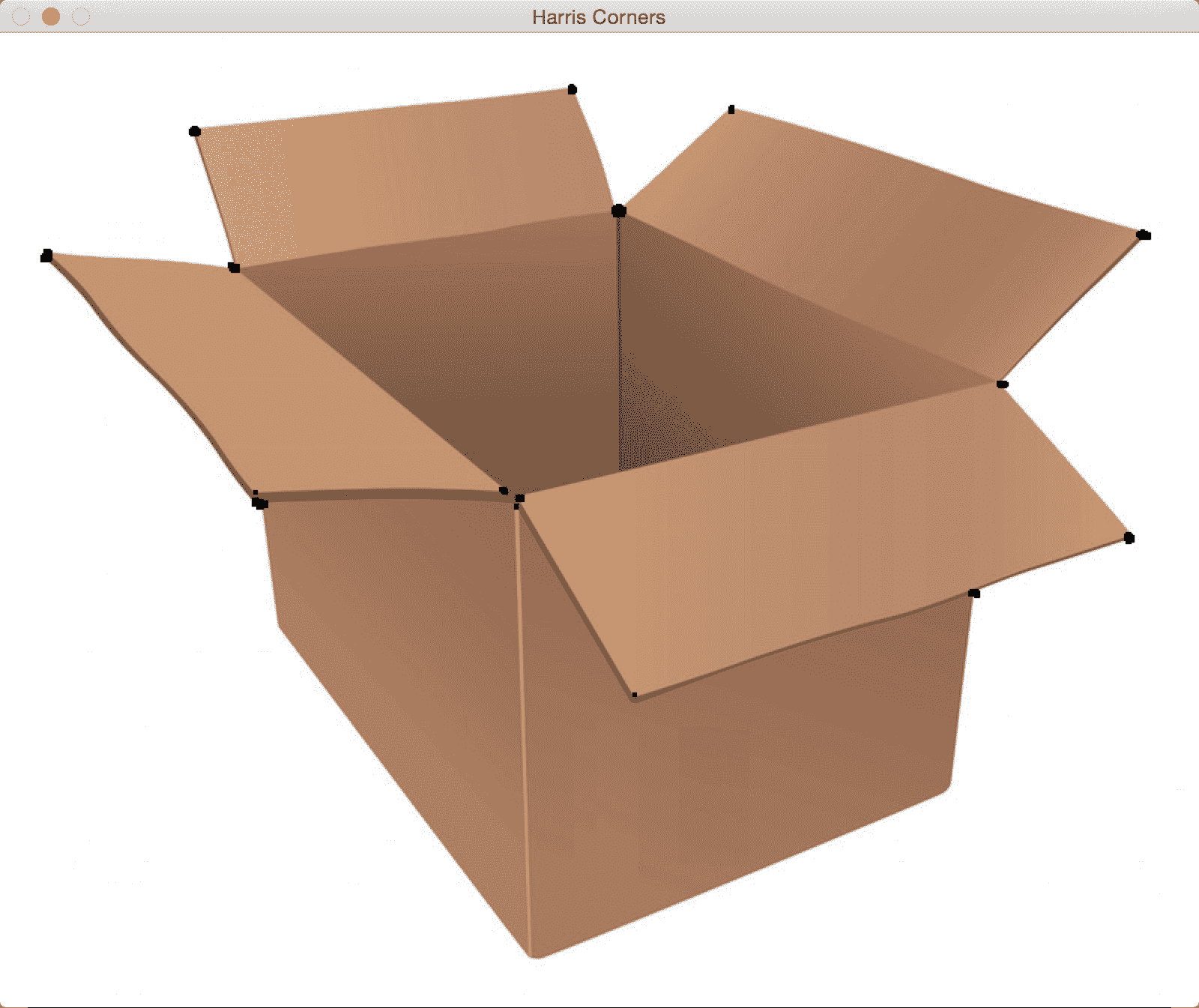 如您所见,所有黑点均对应于图像中的角。 您可能会注意到未检测到盒子底部的角。 原因是角点不够尖锐。 您可以在角点检测器中调整阈值以识别这些角点。 执行此操作的代码如下: