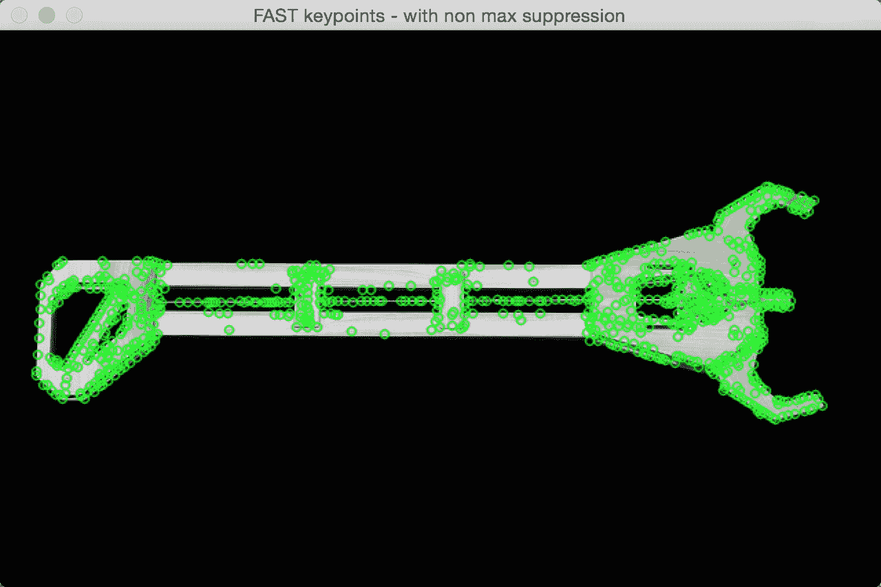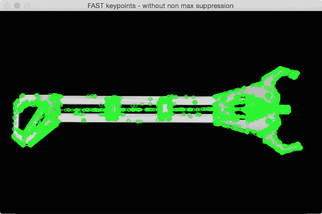 如果我们在此图像上运行 FAST 关键点检测器,您将看到类似以下内容: