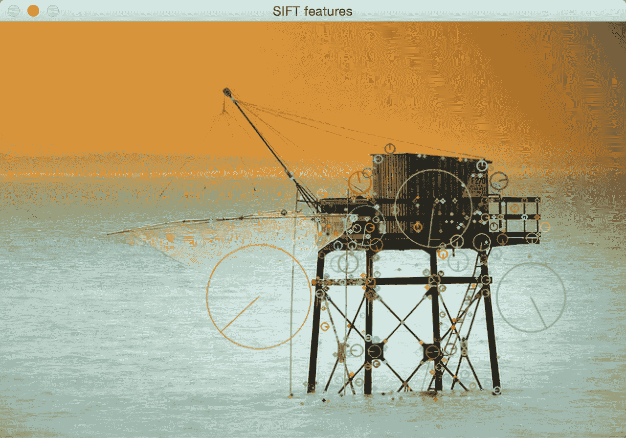 如果使用 SIFT 提取关键点位置,您将看到类似以下的内容,其中圆圈的大小指示关键点的强度,圆圈内的线指示方向:
