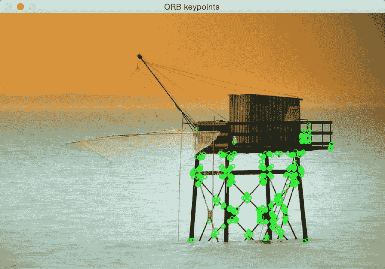 如果在前面显示的图像之一上运行 ORB 关键点提取器,您将看到类似以下内容: