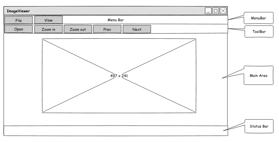 我们可以遵循许多图像查看器应用,例如 Linux 上的 gThumb 和 MacOS 上的 Preview 应用。 但是,我们的应用比进行一些预先计划的应用要简单。 这涉及使用铅笔绘制应用原型的线框。