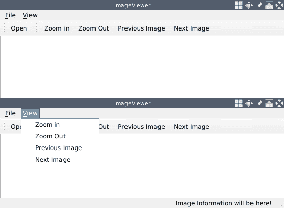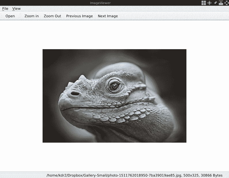 至此,我们已经在主要区域的中心以原始尺寸显示了目标图像。 最后要做的是在状态栏上显示与图像有关的信息。 我们构造一个包含其路径,尺寸和大小(以字节为单位)的字符串,然后将其设置为mainStatusLabel的文本,该文本已添加到状态栏中。