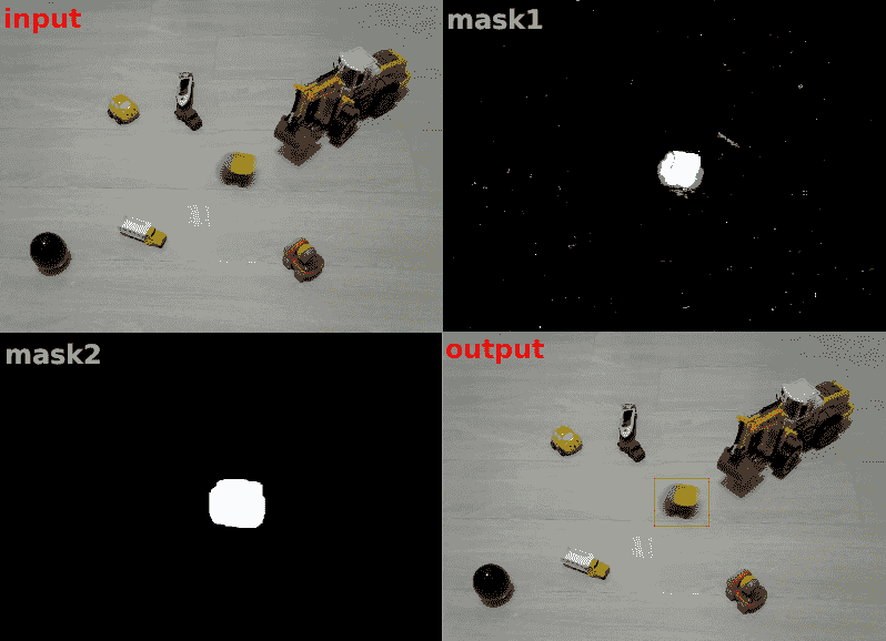 好的,运动检测工作已经完成。 考虑到此过程有点抽象,我们可以保存捕获的帧,提取的前景遮罩,去除噪声的遮罩以及带有矩形的帧作为图像绘制到硬盘上。 下图显示了一个小型垃圾箱在几辆车之间通过时我保存的图像: