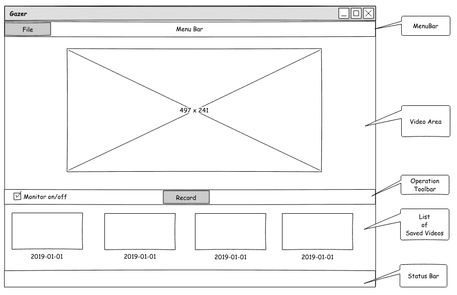 如上图所示,我们将整个窗口分为五个部分:菜单栏,将要播放视频的主要区域,操作按钮所在的操作区域,其中包含已保存视频缩略图的水平列表。 将被放置,以及状态栏。