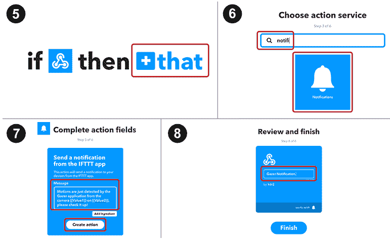 7. 在“完成操作字段”页面上,您将找到一个文本区域。 在文本区域中键入Motions are just detected by the Gazer application from the camera {{Value1}} on {{Value2}}, please check it up!,然后单击创建动作按钮。