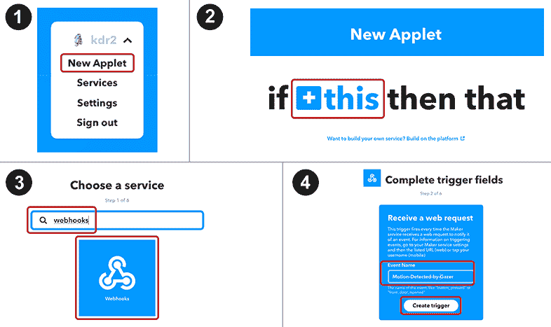 要使用 IFTTT 发送通知,我们需要一个 IFTTT 帐户,该帐户可以在这个页面上创建。 通过一个帐户,我们可以创建一个带有 Webhook 的小程序作为this服务,并将手机通知服务作为that服务。 让我们逐步创建小程序。 创建一个小程序总共需要八个步骤。 以下屏幕截图显示了前四个: