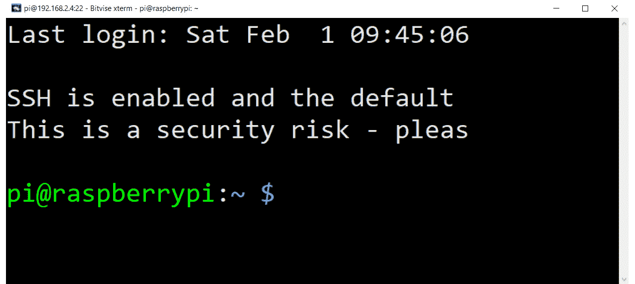 3. 点击“接受并保存”按钮。 这将保存交换的 RSA 密钥。 请注意,如果我们尝试使用同一台 Windows 计算机再次连接到 Raspberry Pi,则不会显示此消息框。 之后,将出现两个单独的窗口。 第一个是 Raspberry Pi 的命令提示符。 就像lxterminal一样,我们也可以从这里运行 Linux 命令: