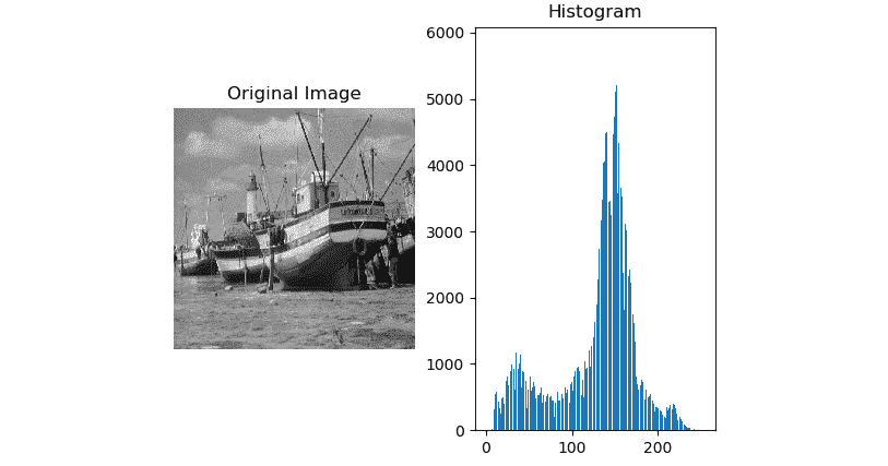 我们知道灰度的强度级别在 0 到 255 之间。因此,我们正在传递有关箱子和 range 的相关参数。 最后,我们使用plt.bar()使用条形图绘制直方图。 以下是输出: