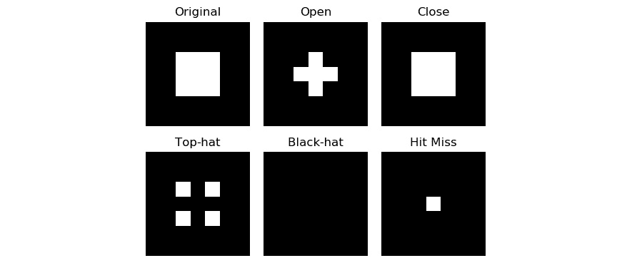 让我们了解在此演示的操作的含义。 腐蚀后接着膨胀被称为开口。 扩张然后腐蚀被称为开放。 高顶礼帽从图像中提取小元素和细节。 高礼帽是输入图像和图像开头之间的差异。 黑帽是图像关闭与图像本身之间的区别。 最终,命中或丢失是一种检测二进制图像中给定配置或模式的操作。